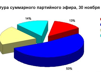 30 ноября соотношение времени, отданного каждой партии, по сравнению с 29 ноября не изменилось: «Единая Россия» получила 66%, «Справедливой России» досталось 9%, ЛДПР – 13%.