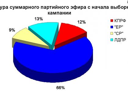 «Единая Россия» получила 6 минут 50 секунд, что составило 53%. ЛДПР получила 14% эфирного времени, «Справедливая Россия» - 20%.