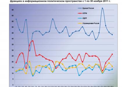 30 ноября 2011 г. в информационном пространстве отмечалось 484 упоминания партии «Единая Россия» или 43,8% от общего числа высказываний, озвученных в адрес парламентских партий. В 297 материалах (26,8%) фигурировала КПРФ, в 178 (16,1%) – «Справедливая Россия», а в 147 (13,3%) – ЛДПР.