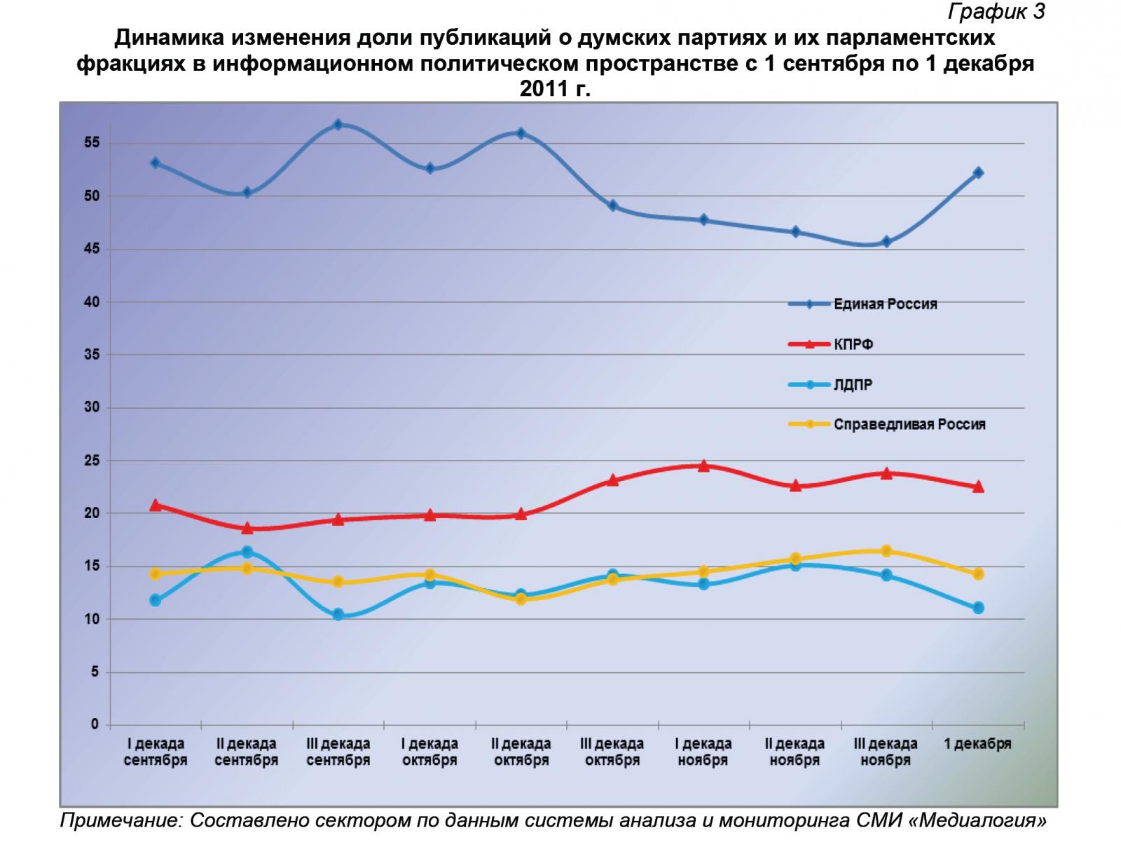 1 декабря 2011 г. в информационном пространстве отмечалось 519 упоминаний партии «Единая Россия» или 52,6% от общего числа высказываний, озвученных в адрес парламентских партий. В 226 материалах (22,8%) фигурировала КПРФ, в 137 (13,8%) – «Справедливая Россия», а в 107 (10,8%) – ЛДПР.