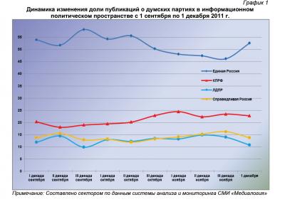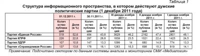 1 декабря 2011 г. в информационном пространстве отмечалось 519 упоминаний партии «Единая Россия» или 52,6% от общего числа высказываний, озвученных в адрес парламентских партий. В 226 материалах (22,8%) фигурировала КПРФ, в 137 (13,8%) – «Справедливая Россия», а в 107 (10,8%) – ЛДПР.