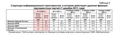 Контент-анализ публикаций СМИ с помощью системы «Медиалогия» позволил выявить следующую структуру информационного пространства, в котором действуют думские политические партии (таблица 1).