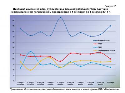 Динамический ряд, отражающий порядок наполнения медиа-потока публикациями о деятельности парламентских партий за период с 1 сентября по 1 декабря 2011 г. (график 1), позволяет заключить, что 1 декабря их показатели были близки к средним за анализируемый период значениям.