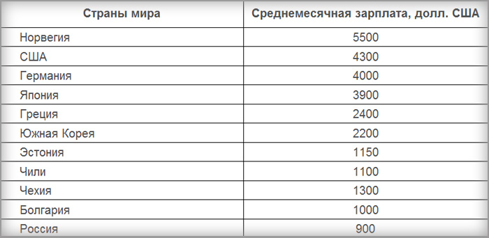 Однако факты говорят о том, что ни двукратное, ни даже трехкратное увеличение средней зарплаты по России, не приблизит нас к европейским и американским показателям. Чтобы понять это, достаточно посмотреть сравнительную таблицу средней заработной платы в 2013 году в России и других странах мира.