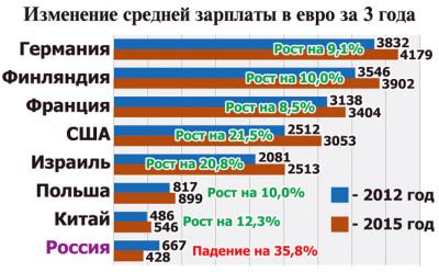 Сегодня средняя зарплата в США выросла до 25,2 доллара (2 тыс. рублей) в час. Средняя продолжительность рабочей недели составила 34,5 часа. Средняя зарплата в Китае 606 долларов в месяц или 2,9 доллара в час. В России средняя зарплата 33 тыс. рублей, что сейчас составляет 423 доллара в месяц или 2,5 доллара в час. При этом у 75% россиян зарплата ниже средней.