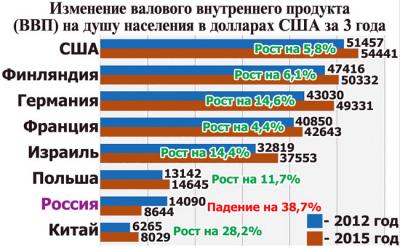 Все это было бы смешно, когда бы не было так грустно. Ведь загнали в тупик страну такие как Греф. Общий уровень катастрофы, или экономического провала, России за последние три года хорошо показан на диаграммах, приведенных рядом. Если кратко все это резюмировать, то цена на нефть упала, рубль провалился, в стране разразился мощный экономический кризис, при этом власть бездействует, а народ нищает. Причем в Европе и США никакого кризиса нет. Сейчас мы по всем основным социально-экономическим показателям (ВВП на душу населения, средняя зарплата и средняя пенсия) уступаем в 2 раза даже Польше.