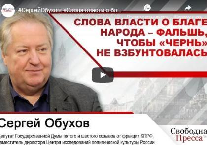 Депутат Государственной Думы пятого и шестого созывов от фракции КПРФ, заместитель директора Центра исследований политической культуры России Сергей Обухов об углубляющемся расслоении общества, его кастовости, что главная цель власти — она сама как источник сверхприбыли и вседозволенности, властно-хозяйственные посты наследуют недалёкие околокремлевские отпрыски, социальная пропасть — один из факторов саморазрушения молодежи, потерявшей веру в жизнь, ускорение потребительской инфляции, «олигархическая» болезнь — сигнал от «черного лебедя».