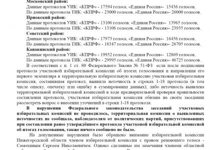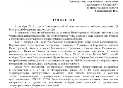 Депутат ГД ФС РФ Николай Рябов направил заявление в адрес руководителя следственного управления Следственного Комитета РФ по Нижегородской области Стравинскаса В.В. В заявлении Н.Ф. Рябов приводит факты фальсификации итогов выборов территориальными избирательными комиссиями по нескольким районам Нижегородской области.