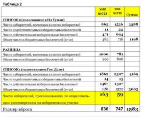 Однако, по непонятным причинам другие избирательные комиссии все же включали в список №1 избирателей, не прописанных в городе, но имеющих право участвовать в голосовании на выборах в Государственную Думу, так в УИК №730 был включен 781 такой избиратель! В связи с этим, в большинстве избирательных комиссий возникла разница между списками в численности избирателей в момент завершения голосования (смотрите приложение №1 - первая строка списка 2 и списка 1). Причины этого требуют дополнительного исследования, но я убежден, что значительная часть избирателей (ровно 1000 человек (?!)), проголосовавших по дополнительному списку в УИК №728, затем проголосовала и по другим участкам. Возможно, это вылезет в ходе следствия.