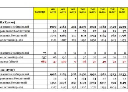 Разница в количестве бюллетеней по выборам в Государственную Думу и выборами в Ил Тумэн составила 806 штук. Однако только 59 человек проголосовало по открепительным удостоверениям, таким образом общее число вброшенных бюллетеней на участке составило 747 штук! Например: УИК № 730 (см. таблицу 2).
