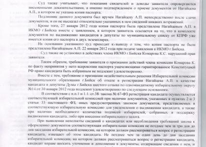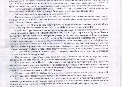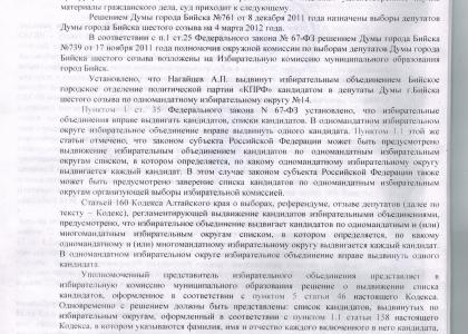 3 февраля 2012 года Бийский городской суд признал незаконным отказ избиркома города в регистрации кандидата в депутаты Думы города Бийска от КПРФ А.П. Нагайцева. Уже 4 февраля 2012 года, на заседании, избирательная комиссия зарегистрировала Нагайцева по одномандатному округу № 14, выдав соответствующее удостоверение.