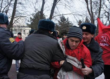 Большая группа участников акции, включая депутата ЗСРО Е.И. Бессонова, секретаря ОК КПРФ И.Н. Нестеренко, была задержана и доставлена в Пролетарское отделение полиции. Характерно, что полицейские хватали и посторонних граждан, которые снимали на телефоны происходящее полицейское бесчинство. Так, например, они отправили на Базарную,2, в отдел по делам несовершеннолетних студента Шаповалова Максима, который просто случайно проходил мимо.