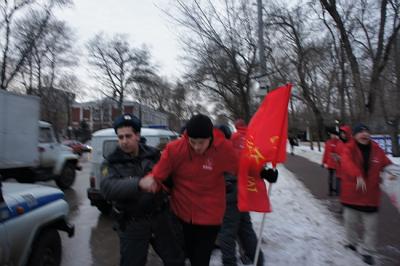 Большая группа участников акции, включая депутата ЗСРО Е.И. Бессонова, секретаря ОК КПРФ И.Н. Нестеренко, была задержана и доставлена в Пролетарское отделение полиции. Характерно, что полицейские хватали и посторонних граждан, которые снимали на телефоны происходящее полицейское бесчинство. Так, например, они отправили на Базарную,2, в отдел по делам несовершеннолетних студента Шаповалова Максима, который просто случайно проходил мимо.