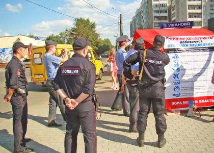 Но полицейские не вняли здравому предложению. Они вызвали подкрепление – еще две полицейские автомашины. Некоторые сотрудники правоохранительных органов прибыли даже с автоматами. После этого к коммунистам применили силу. Первым подхватили под мышки и забросили в полицейский автомобиль Первого секретаря Ивановского обкома КПРФ В.В. Клёнова. Такая же судьба ждала и других партийных товарищей: заломили руки секретарю Ивановского обкома КПРФ по организационно-партийной и протестной работе, уполномоченному представителю избирательного объединения А.Д. Бойкову, агитаторам КПРФ - матери и дочери В.А. Алексеевой и Л.В. Антошкиной. В это время прохожие открыто выражали свое возмущение грубыми действиями полиции, а временами и полубандитскими.