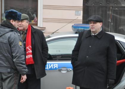 Пикет подходил к концу, когда группа полицейских приблизилась к пикетчикам с целью задержания коммунистов. Полицейскими был немедленно задержан помощник депутата Ворноцова коммунист С.В. Веснов за то, что держал в руках Знамя Победы. Следующей «жертвой» полиции был избран ветеран партии, инвалид, недавно вышедший из больницы В.В. Козлов, однако правоохранители тут встретили жесткий отпор пикетчиков и депутата-коммуниста Воронцова, не позволивших задержать ветерана. После продолжительной перепалки полиция приняла решение переключить внимание на новую «жертву» - был задержан помощник депутата Воронцова коммунист А.М. Богачев.