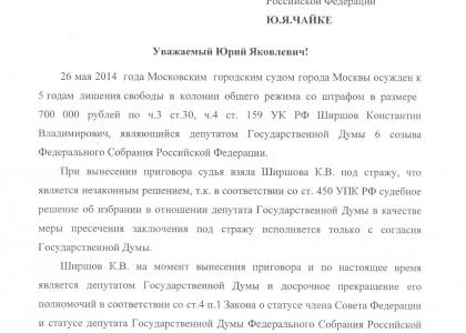 В обращении к Генпрокурору Ю.Я. Чайке, в частности, говорится, что Константин Владимирович Ширшов, являющийся депутатом Государственной Думы 6 созыва Федерального Собрания Российской Федерации, при вынесении приговора был незаконно взят под стражу. Согласно статье 450 УПК РФ арест депутата Государственной Думы возможен только с согласия Государственной Думы. Досрочное прекращение депутатских полномочий (по ст.4, п.1. Закона о статусе члена Совета Федерации) возможно только при вступлении в законную силу обвинительного приговора суда.