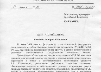Депутаты ГД фракции КПРФ А.Д. Куликов, С.П. Обухов, С.И. Юрченко, Н.Ф. Рябов направили генеральному прокурору РФ Ю.Я. Чайке в связи с гибелью в СКР генерала МВД Б.Б. Колесникова.