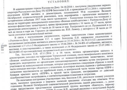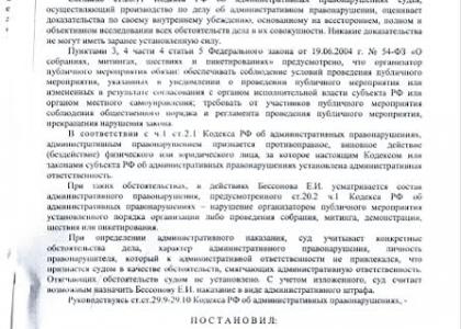 Пролетарский районный суд города Ростова-на-Дону признал руководителя фракции КПРФ в Законодательном Собрании Ростовской области, первого секретаря Ростовского-на-Дону горкома КПРФ Евгения Бессонова виновным в нарушении части 1 статьи 20.2 КоаП РФ «Нарушение установленного порядка организации либо проведения собрания, митинга, демонстрации, шествия или пикетирования».