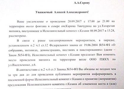 20 сентября в сквере им. Тинчурина планировался митинг КПРФ с требованием отмены несправедливой «абонентской платы» в детсадах и в поддержку законопроекта депутата-коммуниста Артёма Прокофьева, который направлен на достижение этой цели. Но исполком г. Казани отказал в его проведении, потому что ему не понравились такие цели публичного мероприятия.