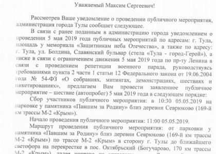 Нет, формально автопробег не был запрещён, но маршрут для него предложен не менее издевательский, чем сценарий, который пытались навязать тульским коммунистам на Первомай. Вместо центральных улиц города-героя организаторам предложено проехаться от деревни Севрюково до посёлка Обидимо бывшего Ленинского района, который в 2014 году вошёл в состав Большой Тулы. То есть часть маршрута пришлось бы проделать по федеральной автодороге М-2 «Крым» в день, когда многие дачники и другие люди возвращаются в свои города после длинных выходных, создавая неудобства, заторы и пробки. Да и кто увидел бы эти красные флаги на машинах в небольших деревнях и посёлках?
