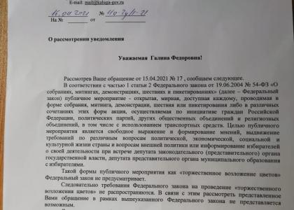 Уведомление на возложение цветов к памятнику В.И.Ленину в сквере В.И.Ленина было направлено как обычно за 5 дней - 15 апреля. Но власти города нам отказали. Как говорится: кому-то можно, а нам – нет.