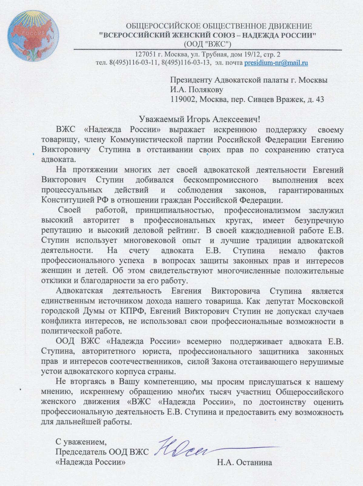 ООД ВЖС «Надежда России» всемерно поддерживает адвоката Е.В. Ступина, авторитетного юриста, профессионального защитника законных прав и интересов соотечественников, силой Закона отстаивающего нерушимые устои адвокатского корпуса страны.