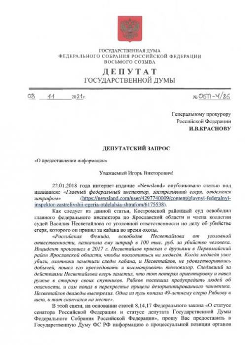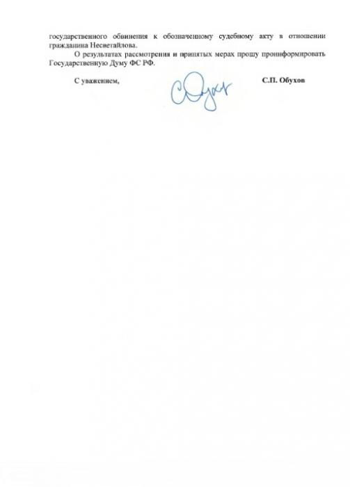 Депутат Сергей Обухов адресовал депутатский запрос в Прокуратуру с просьбой прояснить позицию стороны обвинения по этому делу. В ответном письме заместитель Генпрокурора Ткачев И.В. указал, что Несветайлову было инкриминировано преступление небольшой тяжести, но не указал конкретную статью.
