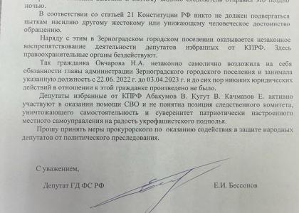 Наряду с этим в Зерноградском городском поселении осуществляется незаконное воспрепятствование деятельности депутатов, избранных от КПРФ. Здесь правоохранительные органы бездействуют. Так, гражданка Н.А. Овчарова незаконно самолично возложила на себя обязанности главы администрации Зерноградского городского поселения и занимала указанную должность с 22.06. 2022 г. до 03.04.2023 г. и до сих пор никаких юридических действий в отношении нее произведено не было.