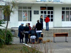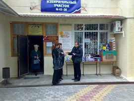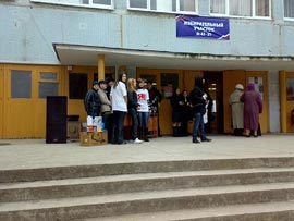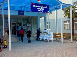 Голосование по выбору символа Олимпиады-2014 на входе в избирательный участок.