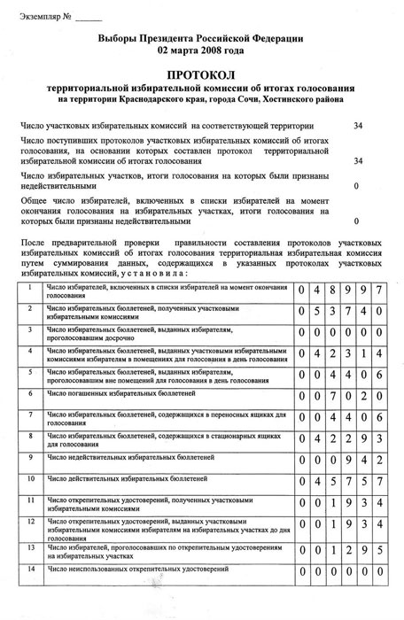 Как видно, г-на Чурову, делающему вид, что он ничего противоправного не происходит, явно придётся сочинять новые сказки. Хотя сфера даже для сомнительно правдоподобных версий - у представителя КПРФ заболела голова и она получила неправильный протокол со всеми подписями и печатями - явно сужается Ведь существуют не только распечатка с фальсифицированных данных ГАС «Выборы» на 04.03.2008 года, где у Д.А.Медведева оказались лишние 2900 голосов, у Г.А.Зюганова – отнято 1550, но и реально имеется бумажная версия подложных данных Хостинского ТИК.