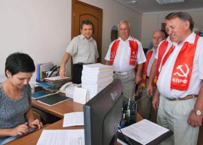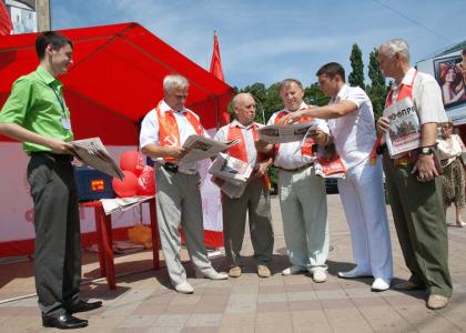 У здания горизбиркома была развернута агитационная палатка КПРФ, где все желающие могли получить материалы, рассказывающие о новой инициативе коммунистов по проведению юридически значимого общегородского референдума.