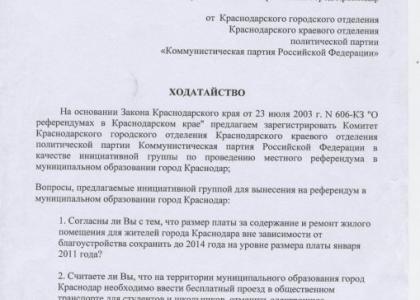 Коммунисты Краснодара во главе с первым секретарем горкома КПРФ, профессором Иваном Чуевым инициируют проведение общегородского референдума, сообщает газета «Правда» на первой полосе. В горизбирком поданы необходимые документы и подписи инициативной группы.