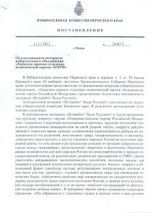 Сегодня представителю КПРФ избирательная комиссия Пермского края вручила постановление №29/07-2 от 11.11.2011, в котором сказано, что агитационный материал «Вставайте! Люди Русские!» признан экстремистским.