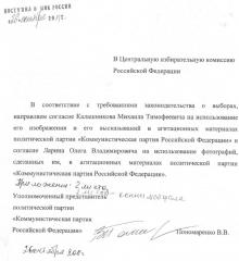 1. Избирательное объединение политическая партия «Коммунистическая партия Российской Федерации» имеет согласие М.Т. Калашникова на использование его изображения и его высказываний в своих агитационных материалах. На согласии стоит не только личная подпись, но и индивидуальная печать М.Т. Калашникова.