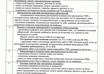 - своевременное оповещение руководителя команды или председателя УИК о подозрительных действиях оппонентов (если они постоянно что-то записывают, ведет скрытую съемку, проявляет нездоровый интерес к определенному столу комиссии)