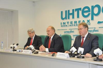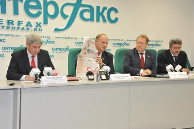 В пресс-конференции приняли участие Первый заместитель Председателя ЦК КПРФ, руководитель Центрального избирательного штаба КПРФ И.И. Мельников и член Президиума, секретарь ЦК КПРФ С.П. Обухов.