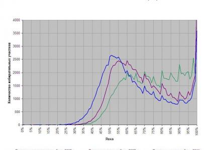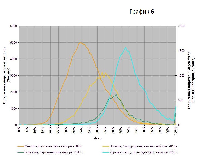1. Распределения участков по явке не имеют колоколообразной формы, как на приведенных выше графиках для зарубежных стран. В первую очередь это касается области высоких явок, где распределение не снижается симметрично начальному участку, а остается на высоком уровне вплоть до явок в 100%. Другими словами, на наших выборах завышено количество участков с высокой явкой.