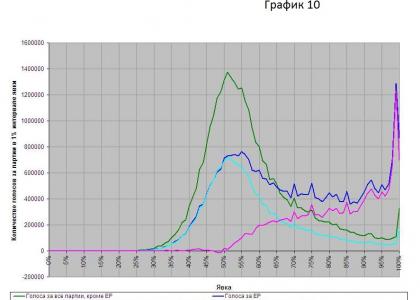 При вычислении на этих данных из 32,1 млн голосов, поданных за ЕР, «нормальными» оказываются примерно 16,8 млн., а «аномальными», т.е. искусственно добавленными – примерно 15,2 млн.