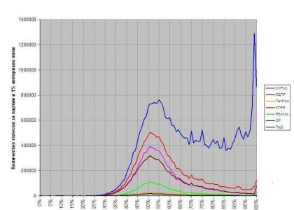 График для «Единой России» немного похож на нормальное распределение разве что в своей начальной левой части, до вершины. Правая часть распределения по голосам за ЕР неестественно растянута вплоть до 100%, а пики на кратных 5% значениях доли голосов однозначно показывают, что на процент голосования за ЕР, как и на явку, был заказ. Надо отметить, что если довести явку до нужного уровня еще теоретически можно, хватая избирателей за рукав на улице и приводя их на участок, то сделать красивый процент голосования можно только после вскрытия избирательных урн и подсчета бюллетеней, то есть только путем прямой подделки результатов.