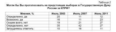 При таких исходных посылках шансы КПРФ на предстоящих выборах выглядят следующим образом (табл. 2). Число твердых сторонников партии за четыре года практически не изменилось (на сегодняшний день – это 12%), зато существенно, более чем вдвое выросла та группа, которая сулит ей свою потенциальную поддержку (23%). Заметная убыль произошла с2007 г. в стане решительных антикоммунистов (с 42% до 27%), в то время как колеблющиеся антикоммунисты, хотя и выросли в числе (с 21% до 27%), но не столь значительно. Напрашивается, таким образом, вывод относительно того, что периодически разыгрываемая карта антикоммунизма (в виде той же «десталинизации» или «детоталитаризации») уже не дает искомого эффекта – она не в состоянии сколько-нибудь существенно повлиять, причем заведомо негативным образом, на электоральные предпочтения.