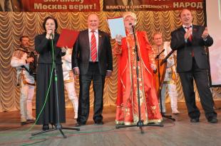 После демонстрации фотобиографии Г.А. Зюганова на сцену была приглашена сопредседатель Союза писателей России, кандидат в члены ЦК КПРФ Л.Г. Баранова-Гонченко, которая в своем выступлении особо подчеркнула важность исторического момента – выборов 4 марта. «Это будет выбор судьбы, выбор нашего будущего», - сказала она. Затем Л.Г. Баранова-Гонченко рассказала о роли личности Г.А. Зюганова в современной российской истории. В частности, она отметила, что именно Геннадий Андреевич в свое время, сформировав фракцию в Госдуме, добился формальной денонсации Беловежских соглашений. Говоря о качествах лидера российских коммунистов, Лариса Георгиевна отметила, что «работать с Геннадием Зюгановым сложно». «А вот, думаю, с Путиным легко – пока он ездит на мотоциклах, его сподвижники чувствуют себя вольготно и спокойно. А Зюганов, наоборот, постоянно работает и заставляет работать свое окружение», - пояснила она.