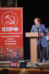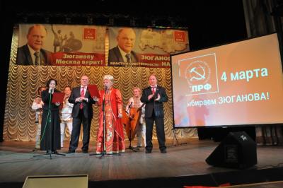 После демонстрации фотобиографии Г.А. Зюганова на сцену была приглашена сопредседатель Союза писателей России, кандидат в члены ЦК КПРФ Л.Г. Баранова-Гонченко, которая в своем выступлении особо подчеркнула важность исторического момента – выборов 4 марта. «Это будет выбор судьбы, выбор нашего будущего», - сказала она. Затем Л.Г. Баранова-Гонченко рассказала о роли личности Г.А. Зюганова в современной российской истории. В частности, она отметила, что именно Геннадий Андреевич в свое время, сформировав фракцию в Госдуме, добился формальной денонсации Беловежских соглашений. Говоря о качествах лидера российских коммунистов, Лариса Георгиевна отметила, что «работать с Геннадием Зюгановым сложно». «А вот, думаю, с Путиным легко – пока он ездит на мотоциклах, его сподвижники чувствуют себя вольготно и спокойно. А Зюганов, наоборот, постоянно работает и заставляет работать свое окружение», - пояснила она.