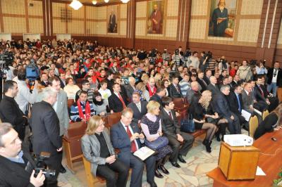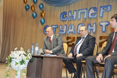 Прямо на сцене Г.А. Зюганов вручил памятные медали ЦК КПРФ «В честь 300-летия М.В. Ломоносова» большой группе преподавателей, студентов и аспирантов вуза во главе с его директором – доктором технических наук, профессором М.П. Вентом.