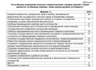 На основе и с учетом этих идеологических предпочтений, выявленных в ходе исследований, респондентам было предложено вывести своего рода формулу правой партии, в которой был бы представлен определенный набор более или менее обязательных элементов (табл. 3). Как оказалось, такая партия, претендующая на наименование правой, должна отстаивать ценности, связанные с неприкосновенностью гражданских прав и свобод, минимальное вмешательство государства в частную жизнь и инициативы граждан (34%), усилением государственной поддержки отечественных товаропроизводителей (25%), созданием независимых органов контроля за действиями власти (24%) и независимой судебной системы (23%), свободой перемещений и выбора места жительства (21%), свободой предпринимательства и перемещения товаров и капиталов, равенством граждан разных национальностей и вероисповеданий (по 18%), усилением государственного регулирования экономики и предпринимательства, контроля за перемещением товаров и капиталов (15%) и т. д.