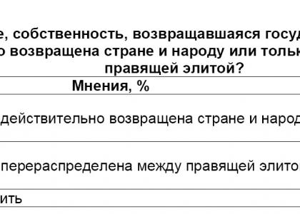 Политика приватизации знала и свои «отливы»: так, в 2000-е гг. государству была возвращена часть некогда приватизированной собственности (табл. 3). Эта «деприватизация» воспринимается с откровенным скепсисом двумя третями опрошенных (66%), убежденных, что за эти мероприятием скрывалось простое перераспределение собственности между правящей элитой, и только примерно каждый десятый (9%) поверил в истинность информации на данный счет.