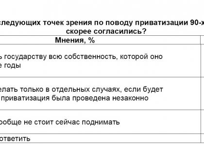 которой оно в те годы лишилось. Не столь безоговорочна, однако, позиция трети респондентов (33%), отстаивающих смягченно-компромиссный вариант возможных «деприватизационных» мер. Они считают, что это можно было бы сделать только в отдельных случаях,