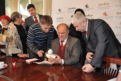 13 февраля в Центральном Доме журналистов состоялась встреча Председателя ЦК КПРФ, кандидата в Президенты России от Компартии и Народно-патриотических сил Г.А. Зюганова с членами Молодежной общественной палаты, молодыми политиками, общественными деятелями и журналистами.