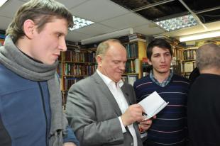 Г.А. Зюганов вечером 14 февраля 2012 года встретился с молодыми российскими писателями и блогерами. Они сами себя называют "культурной оппозицией", и не стесняются задавать даже самые неудобные вопросы кандидату в Президенты. Среди тех, кто пришел на встречу, Сергей Шаргунов, Лев Пирогов, Герман Садулаев, Арслан Хасавов, Сергей Удальцов и другие. Неформальное общение состоялось в книжном магазине "Фаланстер".