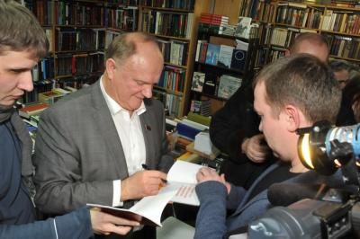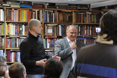 В небольшом книжном магазине, где ради встречи прилавки сдвинули в сторону, где никуда не денешься от запаха новеньких книг, собрались стопроцентно творческие люди: литературные бунтари, блогеры, начинающие и уже зарекомендовавшие себя писатели. Это был скорее диалог, где никто не стеснялся высказывать свое мнение, каждое выступление воспринимали уважительно. «Я люблю такие «непричесанные» встречи. Они заряжают свежестью и легкостью», - уже после признался Г.А. Зюганов.