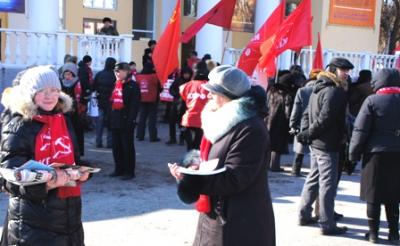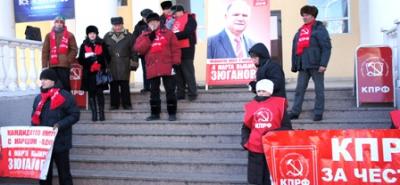 Акция прошла под лозунгами: "КПРФ - за честные выборы!", "Кандидатов много, с народом один - Г.А.Зюганов", "4 марта выбираем Зюганова", "За народного кандидата!", "Даешь честные выборы".